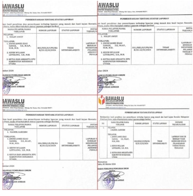 Bawaslu Tolak Dugaan Pelanggaran Calon Bupati dan Wakil JGKWL Juent Mongkaren, Oktober 5, 2024Desember 5, 2024 Newslestari.com – MINUT, Badan Pengawas Pemilu Kabupaten Minahasa Utara mengumumkan penolakan terhadap empat laporan terkait dugaan pelanggaran administrasi dan pemilihan yang diajukan oleh beberapa pelapor. Keputusan ini disampaikan oleh Ketua Bawaslu Minut, Rocky Marciano Ambar, melalui surat resmi yang dirilis pada tanggal 5 Oktober 2024. Dalam surat tersebut, Bawaslu menyatakan bahwa setelah melakukan penelitian dan pemeriksaan terhadap laporan yang masuk, serta hasil kajian internal, semua laporan yang diajukan tidak memenuhi unsur pelanggaran tindak pidana pemilu. Dari empat laporan yang ditolak, dua di antaranya dilaporkan oleh Noldi Awuy dengan terlapor Joune Ganda dan Kevin W Lotulung, Ketua serta Anggota KPU Minahasa Utara. Nomor laporan 001 dan 002/Reg/PB/KAB/25.12/X/2024 dinyatakan tidak memenuhi syarat untuk ditindaklanjuti. Sementara itu, pelapor Maikel Garusim juga mengajukan dua laporan lainnya, yakni nomor 003 dan 004/Reg/PB/KAB/25.12/X/2024, yang juga ditolak dengan alasan serupa; tidak memenuhi unsur pelanggaran tindak pidana pemilu dan syarat administrasi pelanggaran pemilu. Tapi, surat penolakan dari Bawaslu tidak memberikan penjelasan rinci mengenai pokok permasalahan yang dilaporkan oleh para pelapor terhadap calon Bupati nomor urut 2, Joune Ganda dan Kevin W Lotulung, serta ketua dan anggota KPU Minut. Dengan penolakan ini, perhatian publik kini tertuju kepada proses pemilihan yang akan berlangsung 27 November 2024, integritas dan akuntabilitas lembaga penyelenggara pemilu di Minahasa Utara diharapkan dapat terus terjaga selama proses demokrasi Pilkada berlangsung.(**) Related Posts:Ketua BAKKIN Sulut Pertanyakan Temuan BPK RI Tahun…INAKOR Resmi Laporkan Penataan Retribusi dan…Konsorsium Perguruan Tinggi Vokasi Sulut Laksanakan…Bawaslu Menggelar Rapat Evaluasi Tahapan Pungut…Bupati Joune Ganda Lounching Rekam Medik Elektrik,…Empat Penambang Tatelu Minut Tidak Puas Putusan… Agenda Minahasa utara Nasional
