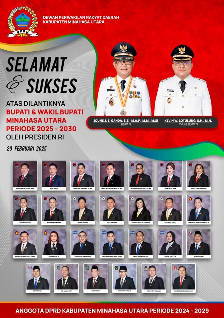DPRD Minahasa Utara Ucapkan Selamat atas Pelantikan Bupati dan Wakil Bupati Terpilih Joune Ganda – Kevin Lotulung Periode 2025-2030 Juent Mongkaren, Februari 20, 2025Februari 20, 2025 Newslestari.com – Minahasa Utara, Dewan Perwakilan Rakyat Daerah (DPRD) Kabupaten Minahasa Utara menyampaikan ucapan selamat dan sukses atas pelantikan Joune Ganda dan Kevin William Lotulung sebagai Bupati dan Wakil Bupati Minahasa Utara untuk periode 2025-2030. Pelantikan tersebut berlangsung di Istana Negara dan dipimpin langsung oleh Presiden Prabowo Subianto serta Wakil Presiden Gibran Rakabuming Raka pada Kamis (20/02/2025). Sekretaris Dewan Kabupaten Minahasa Utara, Yossy Kawengian, bersama seluruh staf Sekretariat DPRD turut menyampaikan apresiasi serta harapan besar terhadap kepemimpinan JG-KWL dalam melanjutkan pembangunan dan meningkatkan kesejahteraan masyarakat Minahasa Utara. “Kami mengucapkan selamat kepada Bapak Joune Ganda dan Bapak Kevin William Lotulung yang kembali mendapatkan kepercayaan dari masyarakat untuk memimpin Minahasa Utara. Kami siap bersinergi dalam mendukung program-program pemerintah demi kemajuan daerah yang kita cintai,” ujar Yossy Kawengian. Pelantikan ini menandai kelanjutan kepemimpinan JG-KWL, yang selama periode sebelumnya telah menunjukkan komitmen dalam membangun infrastruktur, meningkatkan kualitas pendidikan dan kesehatan, serta mengembangkan sektor pariwisata dan ekonomi daerah. Dengan semangat kebersamaan, DPRD Minahasa Utara berharap pemerintahan yang baru ini semakin memperkokoh kemajuan Minahasa Utara menuju masa depan yang lebih gemilang. (Rinte Klabat) Agenda Minahasa utara Nasional