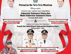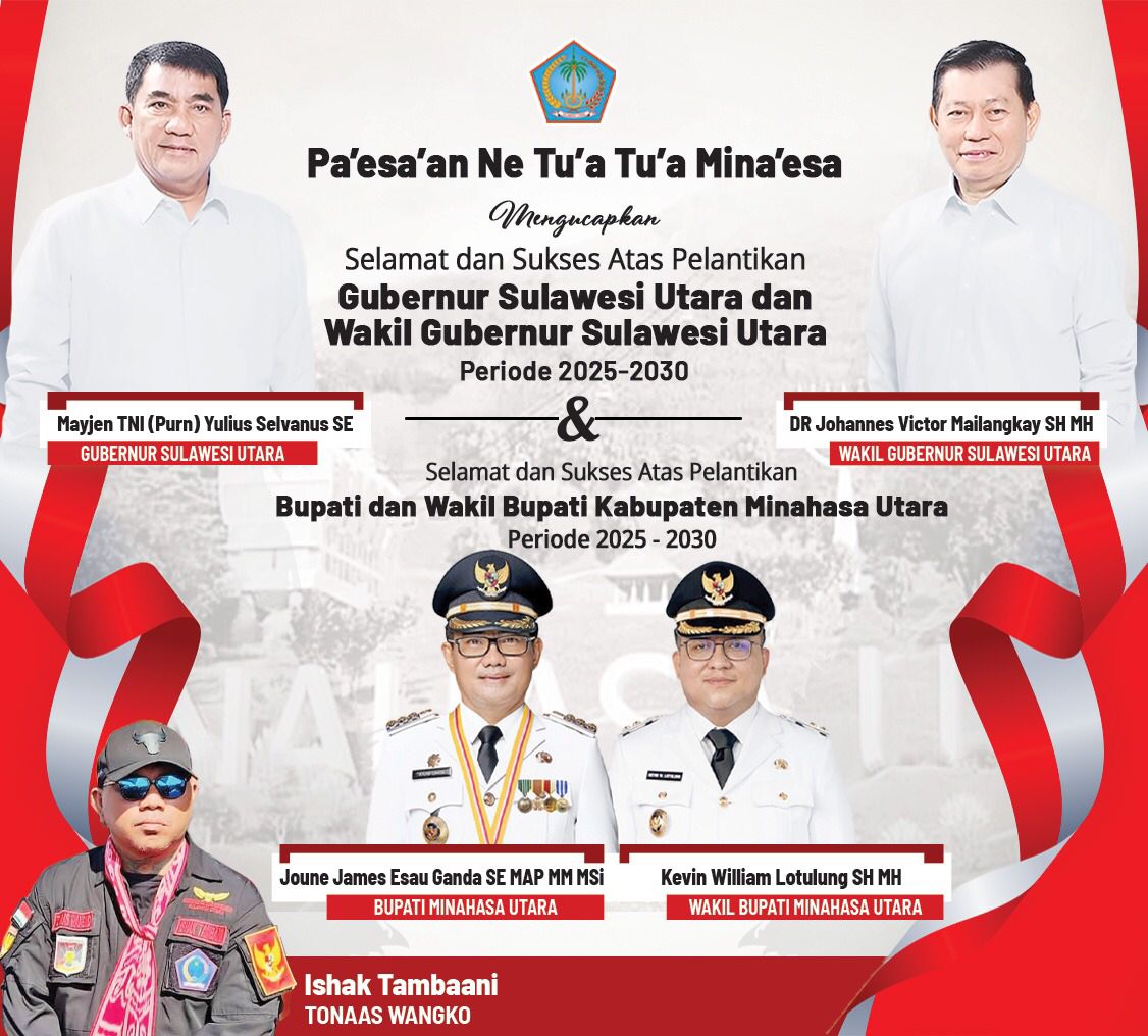 TW Ishak Tambani: Selamat atas Pelantikan Gubernur Sulut Yulius Selvanus Komaling – Victor Mailangkay dan Bupati Minut Joune Ganda – Kevin Lotulung Juent Mongkaren, Februari 20, 2025Februari 20, 2025 Newslestari.com – Jakarta, Tonaas Wangko Ishak Tambani dengan penuh kebanggaan mengucapkan selamat atas pelantikan Gubernur dan Wakil Gubernur Sulawesi Utara, Yulius Selvanus Komaling dan Victor Mailangkay serta Bupati dan Wakil Bupati Minahasa Utara, Joune Ganda dan Kevin William Lotulung, untuk periode 2025–2030. Dalam pernyataannya, Tonaas Wangko Ishak Tambani menyampaikan apresiasi dan harapan besar kepada para pemimpin yang baru saja dilantik (20/02). “Pelantikan ini adalah momentum penting bagi Sulawesi Utara dan Minahasa Utara untuk terus melangkah maju. Saya yakin dengan kepemimpinan Pak Yulius Selvanus Komaling di provinsi dan duet Joune Ganda – Kevin William Lotulung di Minahasa Utara, akan tercipta pembangunan yang semakin pesat dan membawa kesejahteraan bagi masyarakat,” ujar Ishak Tambani. Sebagai seorang tokoh yang dihormati, Tonaas Wangko Ishak Tambani menegaskan dukungannya terhadap sinergi kepemimpinan di tingkat provinsi dan kabupaten. “Kolaborasi dan kerja nyata dari para pemimpin kita ini akan menjadi motor penggerak kemajuan daerah. Saya mengajak seluruh masyarakat untuk bersatu, mendukung, dan berkontribusi dalam mewujudkan Sulawesi Utara yang lebih hebat,” tambahnya. Agenda Jakarta Minahasa utara Nasional Sulut